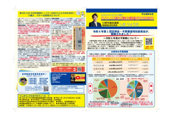 2024.04.5 新しい市政報告を作成いたしました。令和6年第1回定例会・予算審査特別委員会のご報告 Post Share 2024年3月29日新しい市政報告を作成いたしました。 PDF版はこちらからご覧ください。 表面 裏面 Post Share しまりょうた【公式】YouTubeチャンネルにて令和6年第1回定例会 予算審査特別委員会3月7日(木)予算審査の質疑の様子を公開いたしました。Prev post 2024/6/20 令和6年第2回定例会本会議 一般質問のご報告。質問内容の全文です。Next post