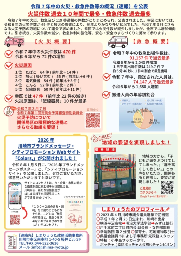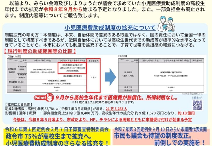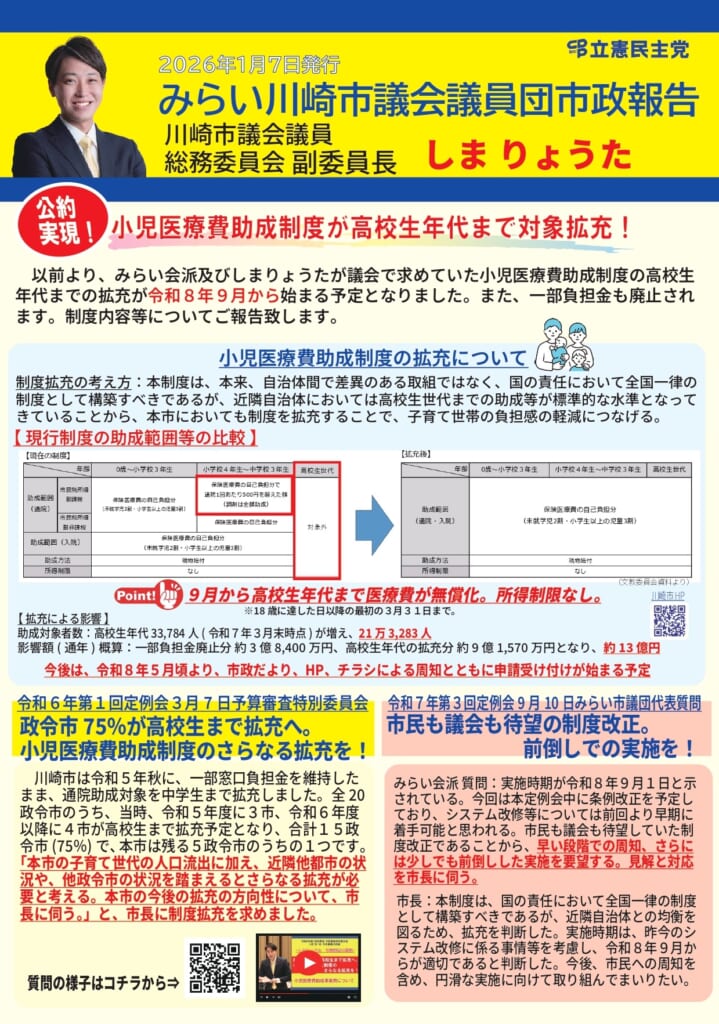 2026.01.8 新しい市政報告を作成いたしました。公約実現!小児医療費助成制度が高校生年代まで対象拡充! Post Share LINE note 新しい市政報告を作成しました。ぜひご覧ください。 Post Share LINE note 新しい市政報告を作成いたしました。令和7年第4回定例会のご報告Prev post