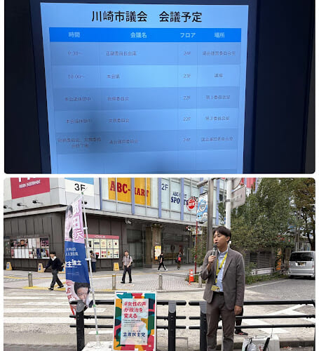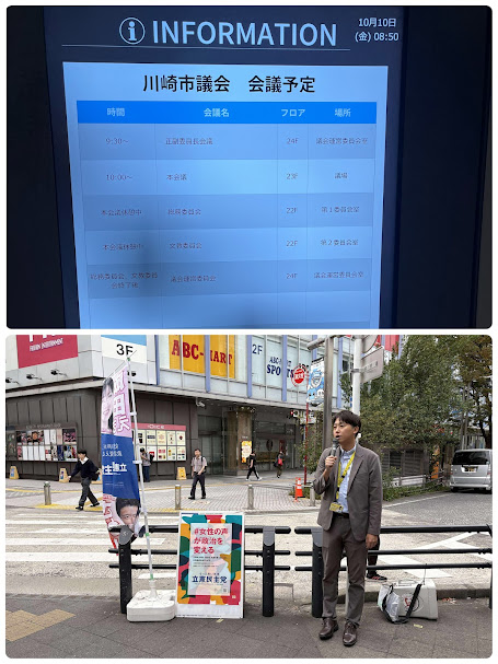 #911 2025/10/10 本日は京急川崎にて朝の駅頭活動!また、本日は議会最終日でした! 2025.10.10 Post Share 今朝は京急川崎駅にて朝の駅頭活動を行いました! 議会最終日は正副委員長会議▶本会議▶総務委員会▶本会議でした! 令和7年度 総務委員会 本会議、予算・決算審査特別委員会等の会議録 無事令和7年度第3定例会が閉会しました。いよいよ選挙モードです🔥 Post Share #910 2025/10/9 今朝も川崎駅東口!議会運営委員会後に総務委員会午後からは川崎市労働組合連合会の定期大会へ参加しました!Prev post #912 2025/10/11 本日は朝川崎駅駅頭活動後、川崎みなと祭りへ!Next post